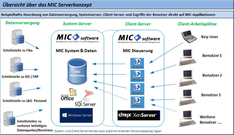 MIC Server können genau auf den Bedarf der Anwenderumgebung angepasst werden. Zentrale Server (MIC COMPANY Server) sind um