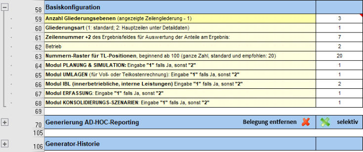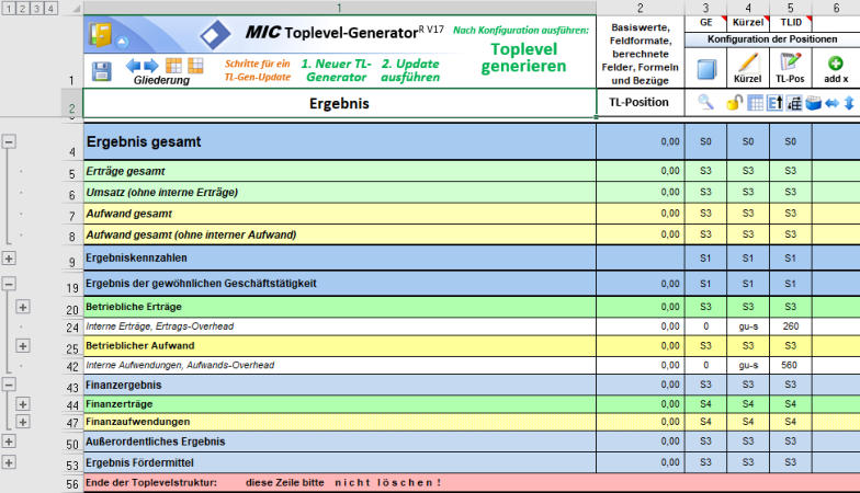 bigen Gliederungsebenen anlegen, ggf. Formeln und Formate hinterlegen
