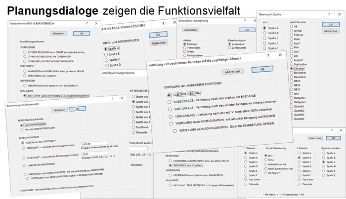 Das folgende Infotableau zeigt einen beispielhaften Ausschnitt aus den vielfältigen praxisbewährten Planungsfunktionen und Steuerungen:
