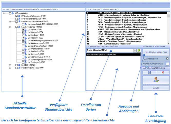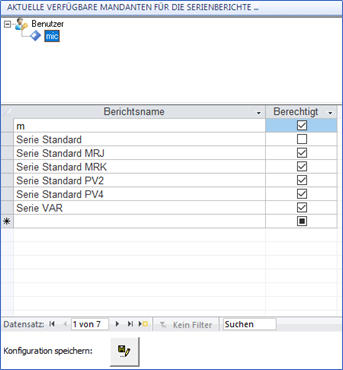 für die Konfigurationsumgebung der Serienberichte. Mit Doppelklick auf das Menüelement „Reporting / Serienberichte“ wird die Konfigurationsmaske