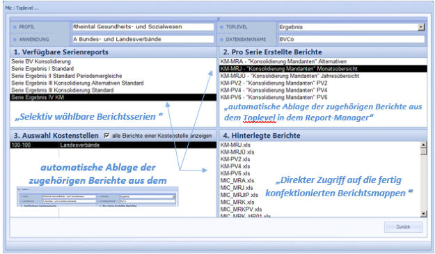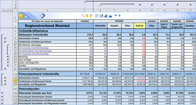 Der Beispielreport 1 aus einer Serie zeigt einen Ergebnisbericht mit Ist-, Soll- und Plandaten und Mandantenvergleichen für den Regionalverband.